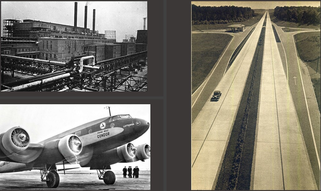 Germany's key Work Creation Program of 1933-36 targeted the creation of a large number of jobs by implementing massive construction programs and by achieving strong industry growth, itself stimulated by the country’s goal of attaining self-sufficiency . The Nazis sensibly proposed a balanced budget instead of simply increasing debt and they decided not to fund the industry directly but indirectly, by reducing its taxes (thus slashing government income) and increasing demand. However, they did not want to decrease social spending to balance the budget. The solution was to finance the enormous construction programs with the work-creation bills outside of the federal budget while fomenting private consumption by the workers who received proper salaries and job security. Then, with millions of additional jobs, the government could collect extra taxes and close the budget gap . Furthermore, Germany fostered international trade with foreign countries employing barter agreements bypassing foreign bank commissions.