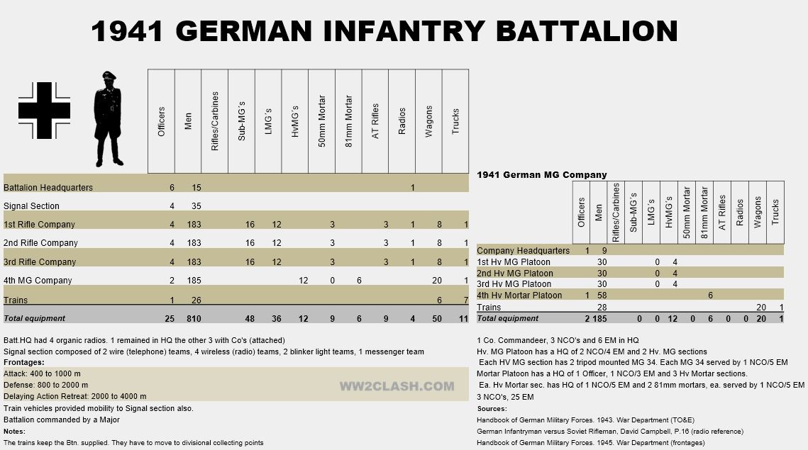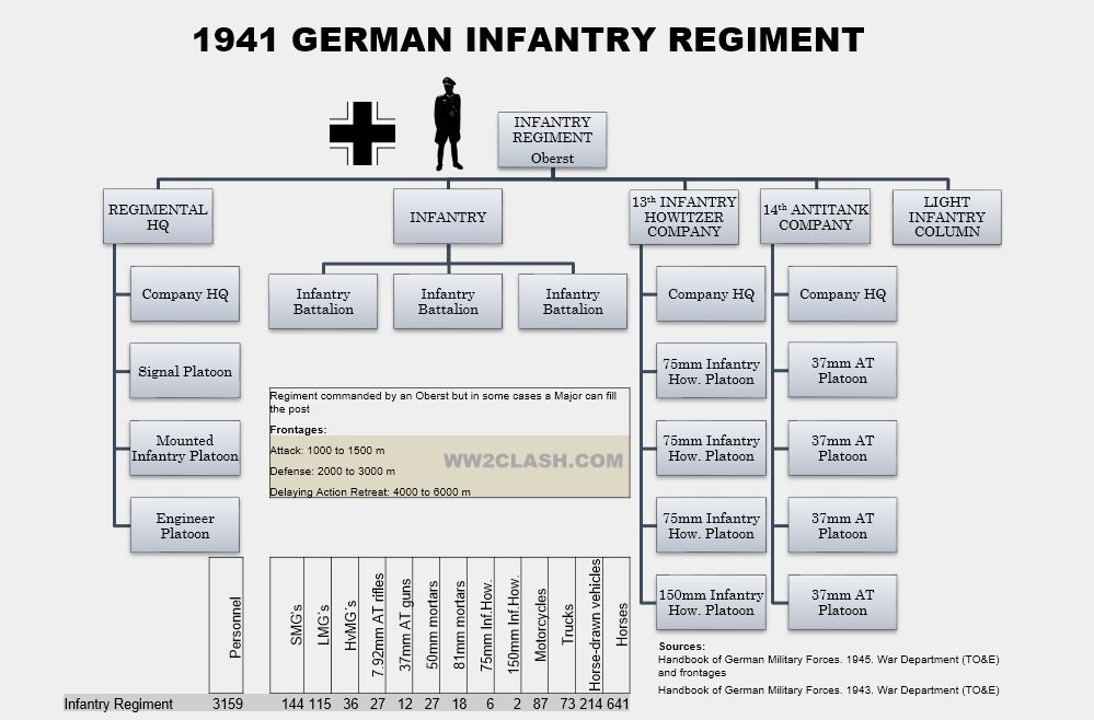 Overall 3.159 men fought in a German IR supported by 144 SMGs, 115 LMGs, 36 heavy MGs, 27 AT rifles, twelve 37mm AT guns, twenty-seven 50mm mortars, eighteen 81 mm mortars, six 75mm light infantry howitzers, two 150mm heavy infantry howitzers, 87 motorcycles, 73 trucks, 214 horse-drawn wagons, and 641 horses.