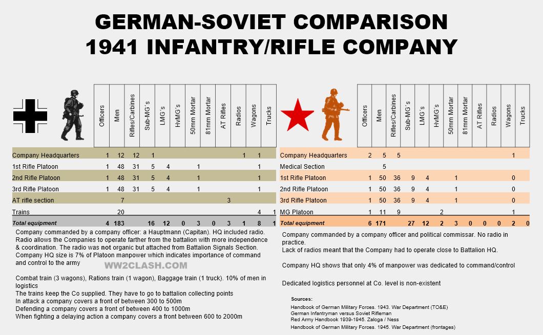 The Soviet Rifle company had 177 men with 27 sub-machine guns, 12 light machine guns, three 50mm mortars, and 2 heavy machine guns. Although its firepower was slightly greater, its means of command, control and logistics were inferior. Not only was the HQ smaller, but it lacked radio and there were only 2 horse-towed wagons for the full company. This meant that the companies had to fight close to the battalion HQ to maintain the communication and they responded slower to orders from it. It also meant that the company depended on the regiment’s help for resupply in case of heavy fighting.
