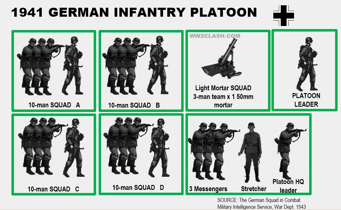 One common attribute that will be found in any fighting unit starting with the squad, is that the unit was built using several identical, less complex units augmented by specialized detachments to increase its firepower and to improve command, control, and logistics. A German 1941 squad had 10 soldiers: