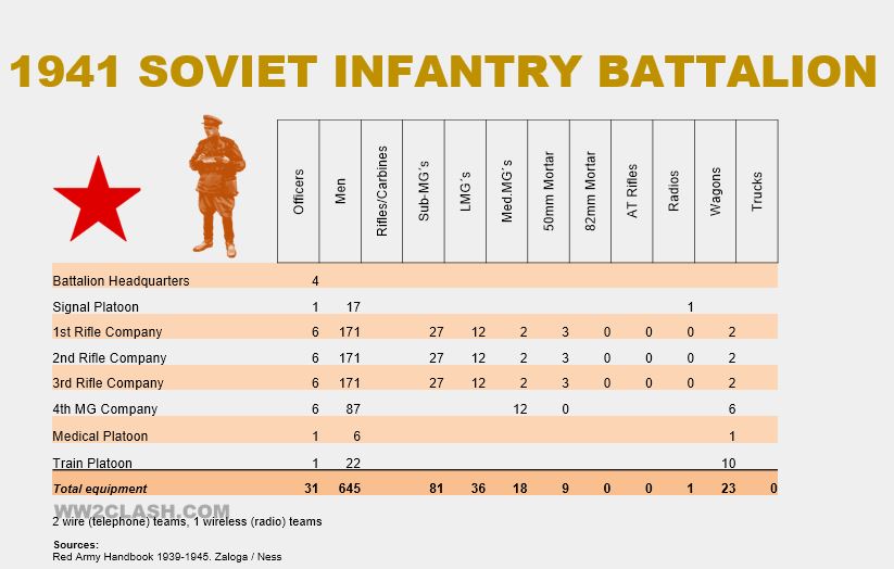 The Soviet battalion was 676 men strong with 3 rifle companies and a heavy machine company, the latter with 12 heavy machine guns (but without mortars). The organic signal platoon was half the size of the German signal section and held only 2 telephone teams and one radio. The HQ was also two-thirds the size of that of its opponent, making the unit less capable to react quickly to the rapidly changing conditions found in war.
