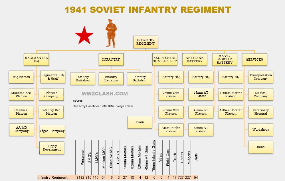 The Soviet infantry regiment was similarly sized, and its equipment provided about the same firepower than its German counterpart. It consisted of 3.182 men with 315 SMGs, 116 LMGs, 54 medium MGs, 6 quad AA MGs, 3 heavy MGs, twenty-seven 50mm mortars, eighteen 82mm mortars, four 120mm mortars, twelve 45mm AT guns, six 76mm infantry guns, 17 trucks, 281 horse drawn carts and wagons, and 727 horses.