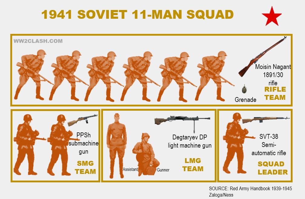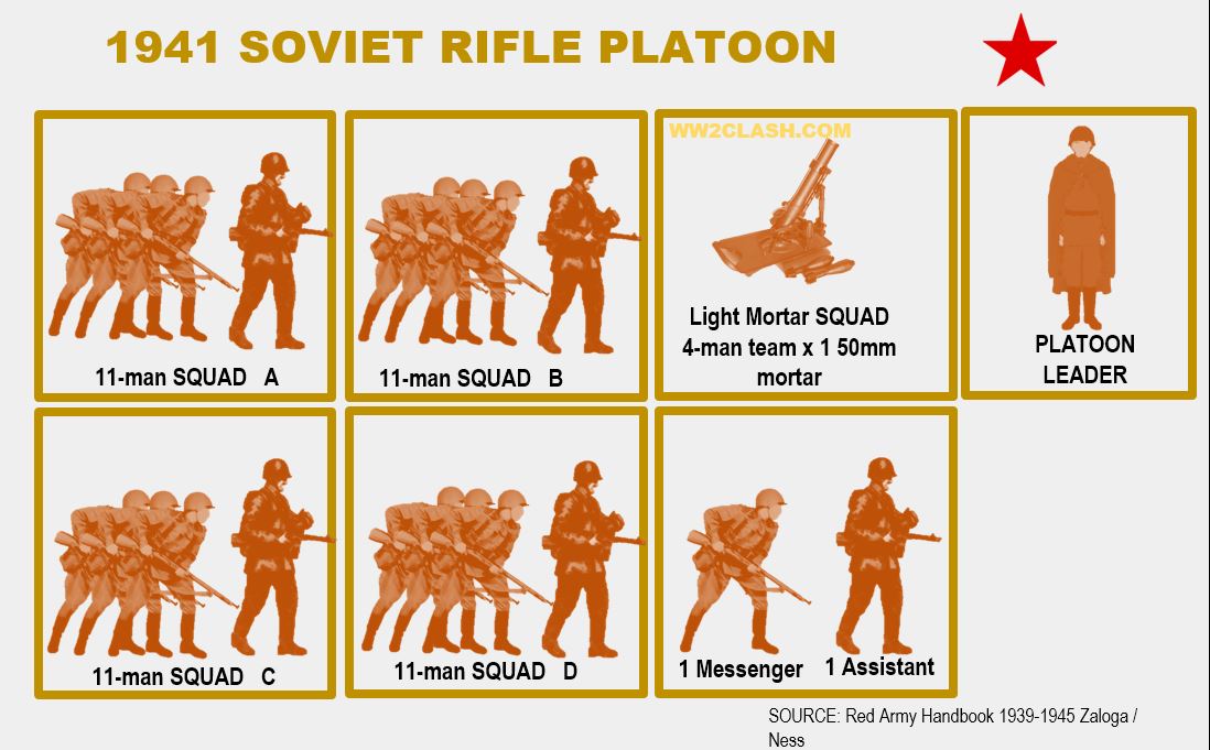 The Soviet platoon also included 4 squads and a light mortar team, but the leader only had the help of an assistant and one messenger, making communication and control less responsive relative to the German platoon. It was 51 men strong, with 9 sub-machine guns, 4 light machine guns, and 1 light 50mm mortar.