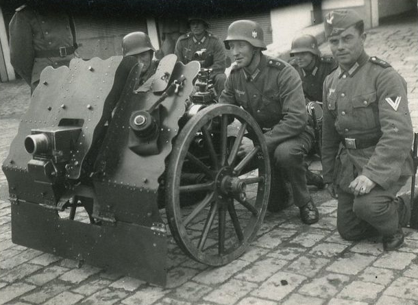 The German infantry regiment incorporated an infantry gun company, named the 13th Infantry Howitzer Company (since the 3 infantry battalions had 12 companies in total). This company had 3 platoons of 75mm light infantry howitzers and 1 platoon of 150mm heavy infantry howitzers. These artillery guns lacked indirect-fire capability and supported the infantry by destroying targets in direct line-of-sight firing mode.