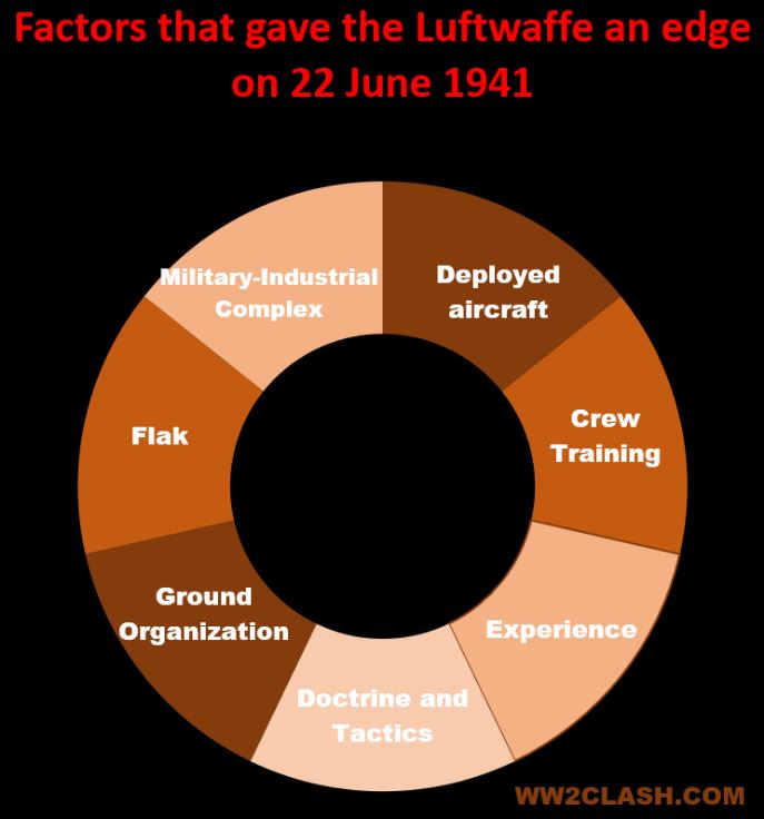 In June 1941 the Luftwaffe was the most capable air force in the world owing to a chain of factors that included deploying the most effective aircraft in almost every category and possessing proficiently trained crews. These two elements turned out to be fundamental, but the outstanding competency of this air force cannot be explained by those factors alone, actually it had deeper roots: it was the result of assimilated experience of its crews and commanders that gave them a thorough understanding of what aspects of air warfare worked and which did not, and the sense to use the equipment at hand for the benefit of the former; a doctrine of operations and related tactics that focused on achievable high-impact goals, fostering proper execution at minimal cost; an effective ground organization that granted the Luftwaffe flexibility to consistently concentrate strong force at critical sectors; skillful and plentiful anti-aircraft units that substantially degraded the efficacy of the opposing air force attacks; and a military-industrial complex that so far had broadly fulfilled the increasing demands of war.
