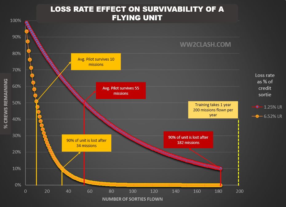 To calculate how long a typical pilot would last, we need to know the loss rate as a percent of credited sorties. This data is not available for German and Soviet pilots, but we estimated a “normal” loss rate of 1.25% and a “heavy” loss rate of 6.52% using known USAAF rates in 1943, the first year of intense operations for the Americans in Europe .
