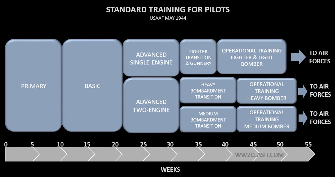 The next figure summarizes the duration of the different courses the USAAF developed to prepare its pilots. It took between 52 to 54 weeks to graduate fighter and bomber pilots. Evidence suggests that in 1941 the Luftwaffe courses were somewhat longer and VVS courses somewhat shorter, but not by much.