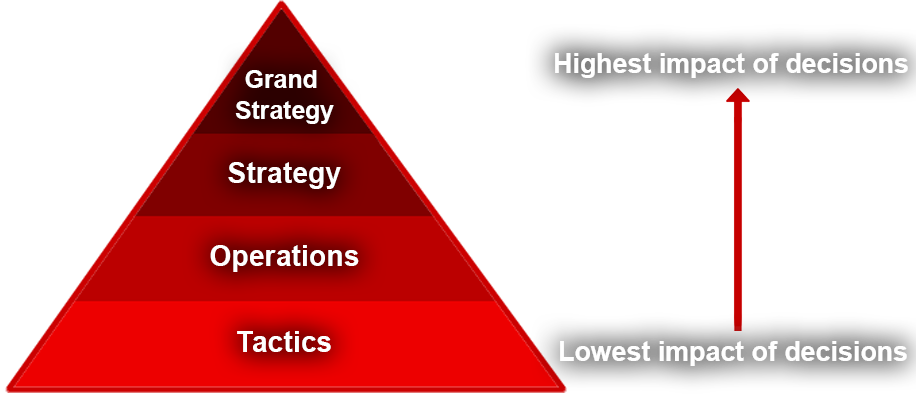 Germans and Russians envisaged war-waging as the enacting of decisions at 4 distinct hierarchical levels: Grand Strategy, Strategy, Operations and Tactics.